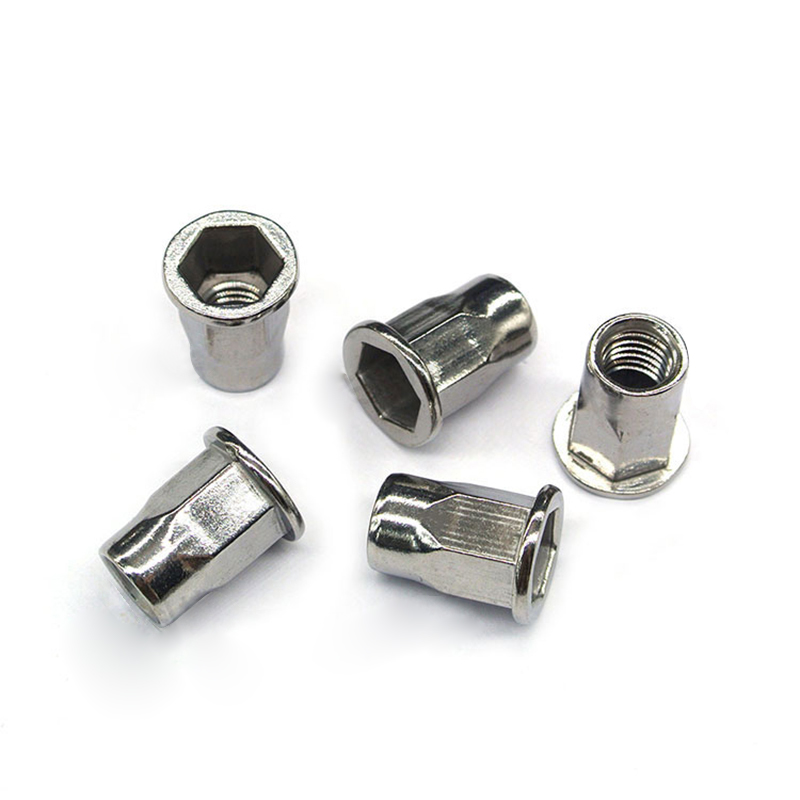 六角拉鉚螺母的安裝方式與普通鉚螺母的安裝方式完全一樣,只是板孔需要沖成相適配的六角形。