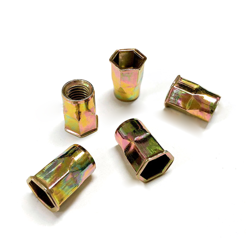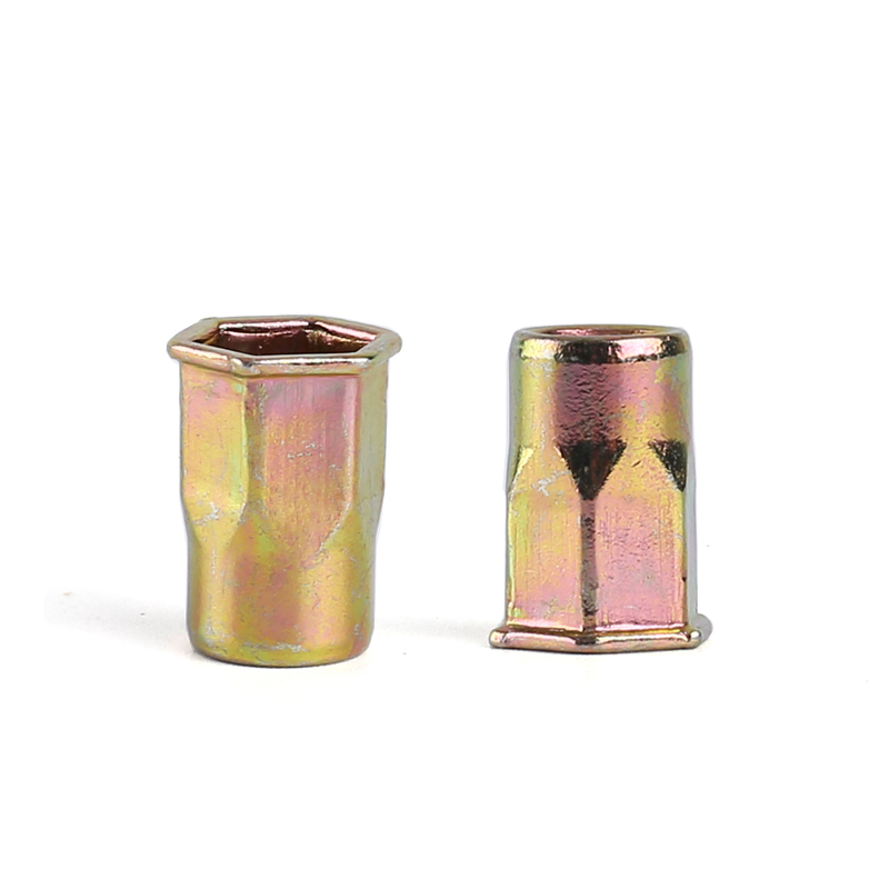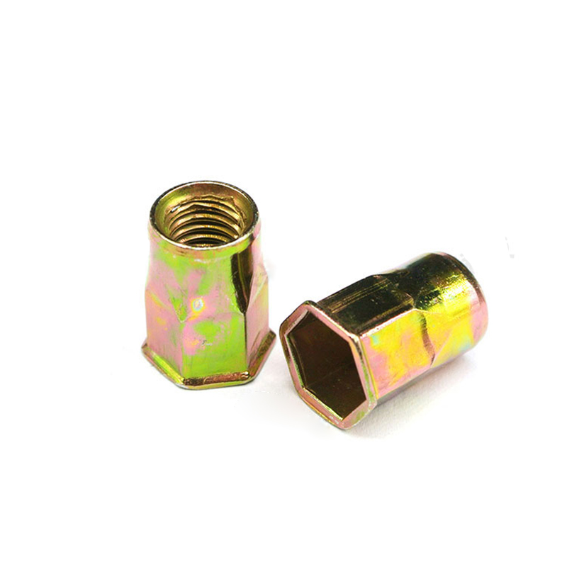 六角拉鉚螺母的安裝方式與普通鉚螺母的安裝方式完全一樣,只是板孔需要沖成相適配的六角形。