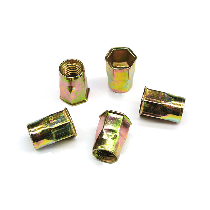 六角拉鉚螺母安裝于板孔因其型式制約從而完全防止打滑,可承受更多的扭力,經(jīng)測(cè)試有螺紋損壞的情況下仍能保待其鉚接牢固。