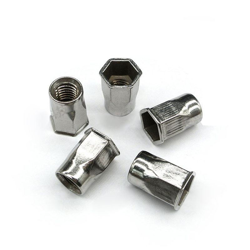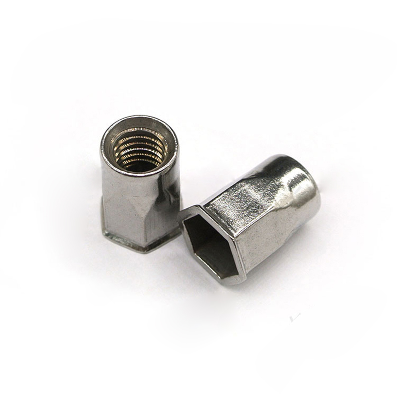 六角拉鉚螺母的安裝方式與普通鉚螺母的安裝方式完全一樣,只是板孔需要沖成相適配的六角形。