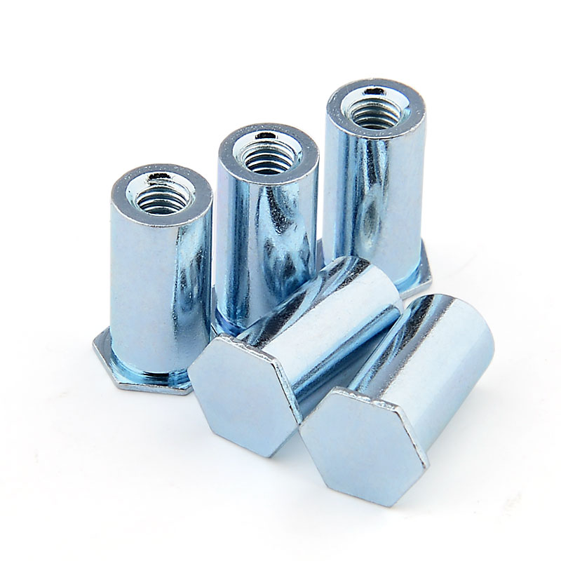 應用于鈑金、薄板、機箱、機柜的一種緊固件,壓鉚螺母柱其外形一端呈六角形,另一端為圓柱狀,六角邊與圓柱狀中間有一道退刀槽,其內形為內螺紋,壓鉚螺母柱通過壓力機將六角頭壓入薄板的預置孔內(預置孔的孔徑一般略大于壓鉚螺柱的圓柱外徑)使孔的周邊產生塑性變形,變形部分被擠入壓鉚螺母柱的退刀槽內,使壓鉚螺母柱鉚緊于薄板上,從而在薄板上形成一下有效固定的內螺紋。